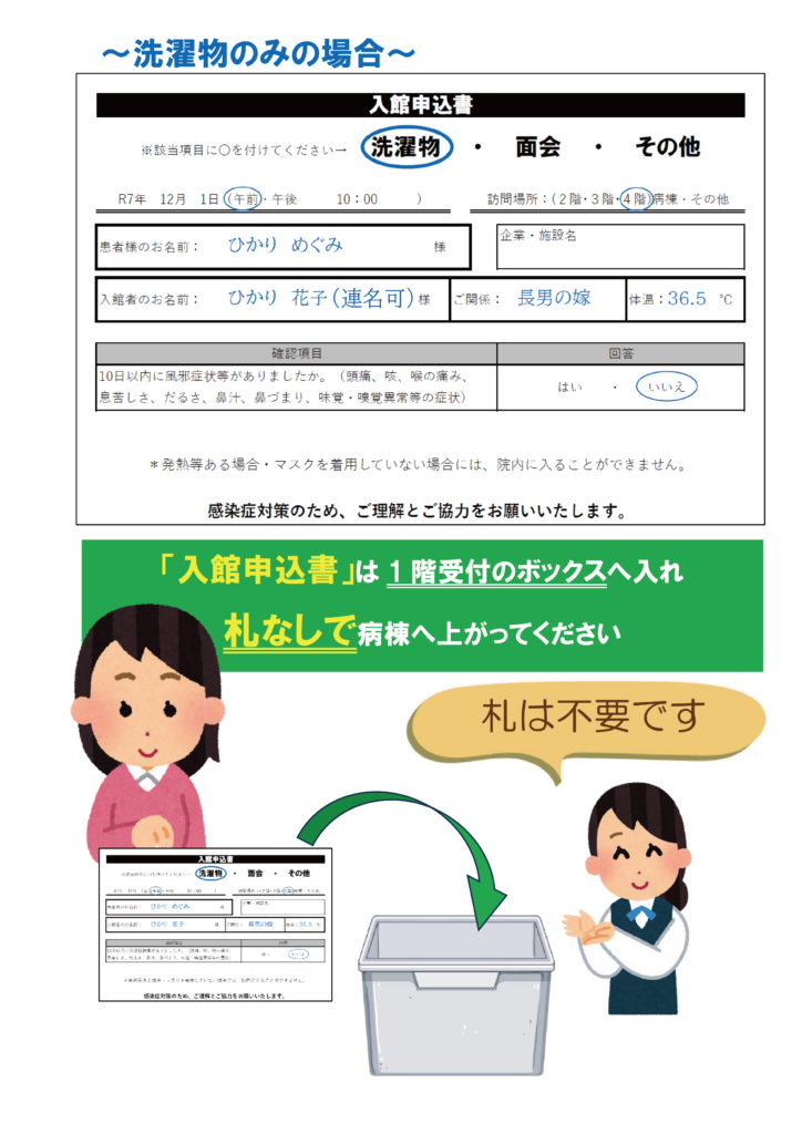 1階受付で記入した「入館申込書」は受付のボックスへ入れ札なしで病棟へ上がってください