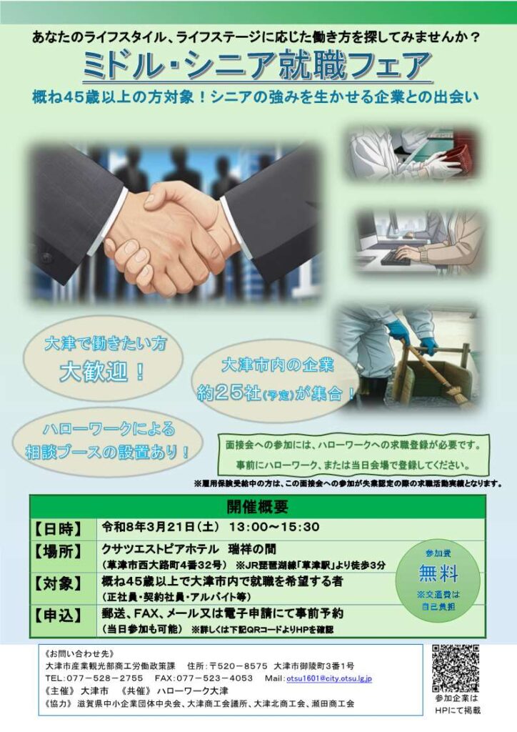「もう一度、地元で働きたい」「これまでの経験を活かせる職場を探したい」45歳以上で大津市内で就職を希望する方、大歓迎です♪説明を聞くだけでも大丈夫です!詳細は下記をご参照いただき、ご興味のある方は是非お越しください♪